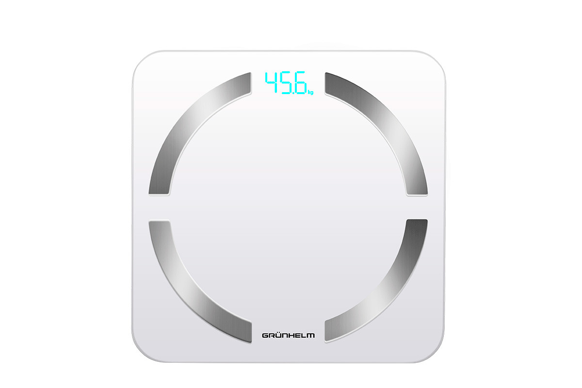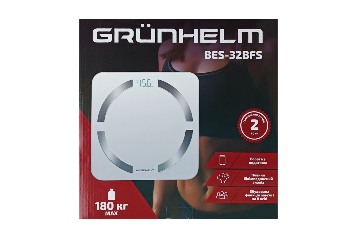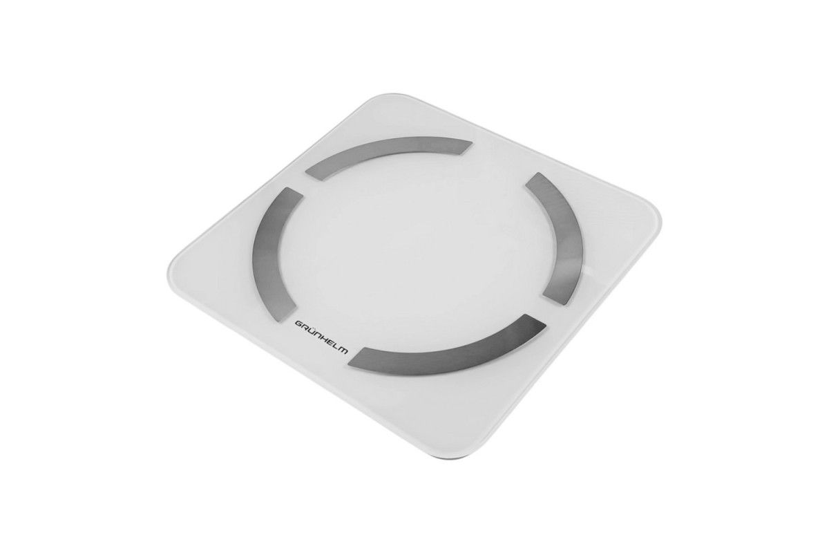 Підлогові ваги GRUNHELM BES-32BFS управляються електронно за допомогою сенсора, всі дані відображаються на дисплеї. Є можливість підключення до Вашого смартфона через Bluetooth. Завдяки біоімпедансного аналізу можна з'ясувати масу тіла, індекс маси тіла, кількість жиру та води, м'язів, кісток, калорій. Панель розміром 30х30 см виготовлена з загартованного скла 5 мм із чотирма металевими пластинами, знизу вставки з ABS пластику. Максимально допустима маса зважування 180 кг, дискретність вимірювання 0.1 кг. Для зручності можна виставити вимір у кілограмах, фунтах, стоунах. Такі додаткові функції, як індикатор перевантаження, низького заряду та автоматичне вимкнення спростять використання ваг.