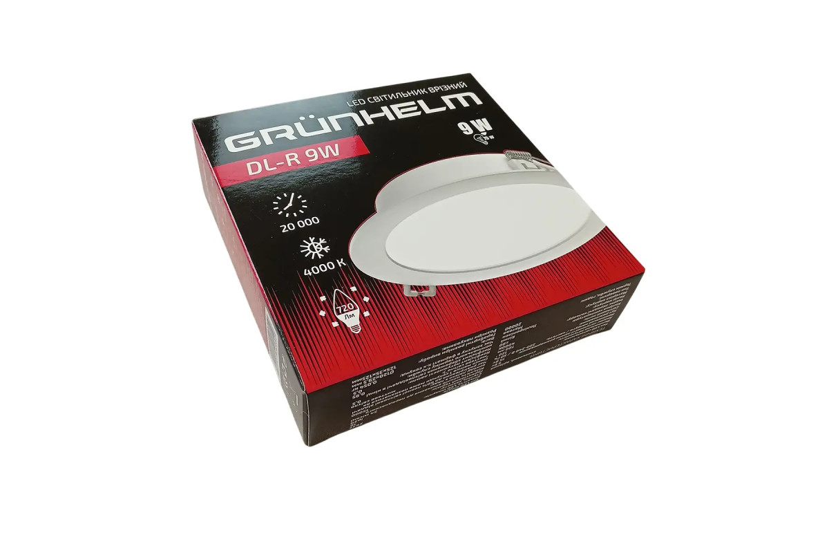 12 місяцяCвітильник LED круглий врізний - DL-R 9W 120х29.5 мм Grunhelm заощадить від 900 кВт/год. за весь строк служби лампи. Не містить ртуті, безпечна для дітей і дорослих.