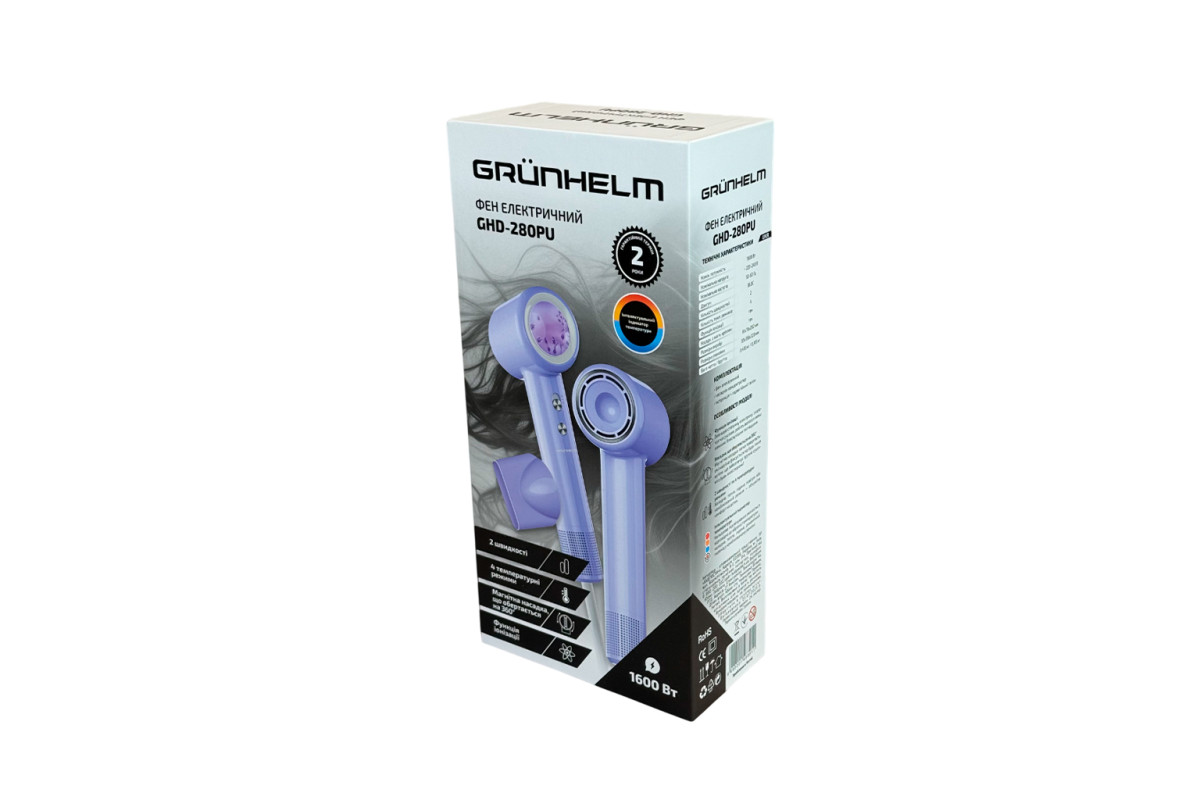 85x158x328 ммФен GHD-280PU Grunhelm - це ідеальний інструмент для швидкого та якісного сушіння і укладання волосся. Завдяки високій потужності та гнучким налаштуванням, він забезпечує професійний догляд у домашніх умовах, допомагаючи створити ідеальну зачіску, зберігаючи здоров'я та блиск волосся.