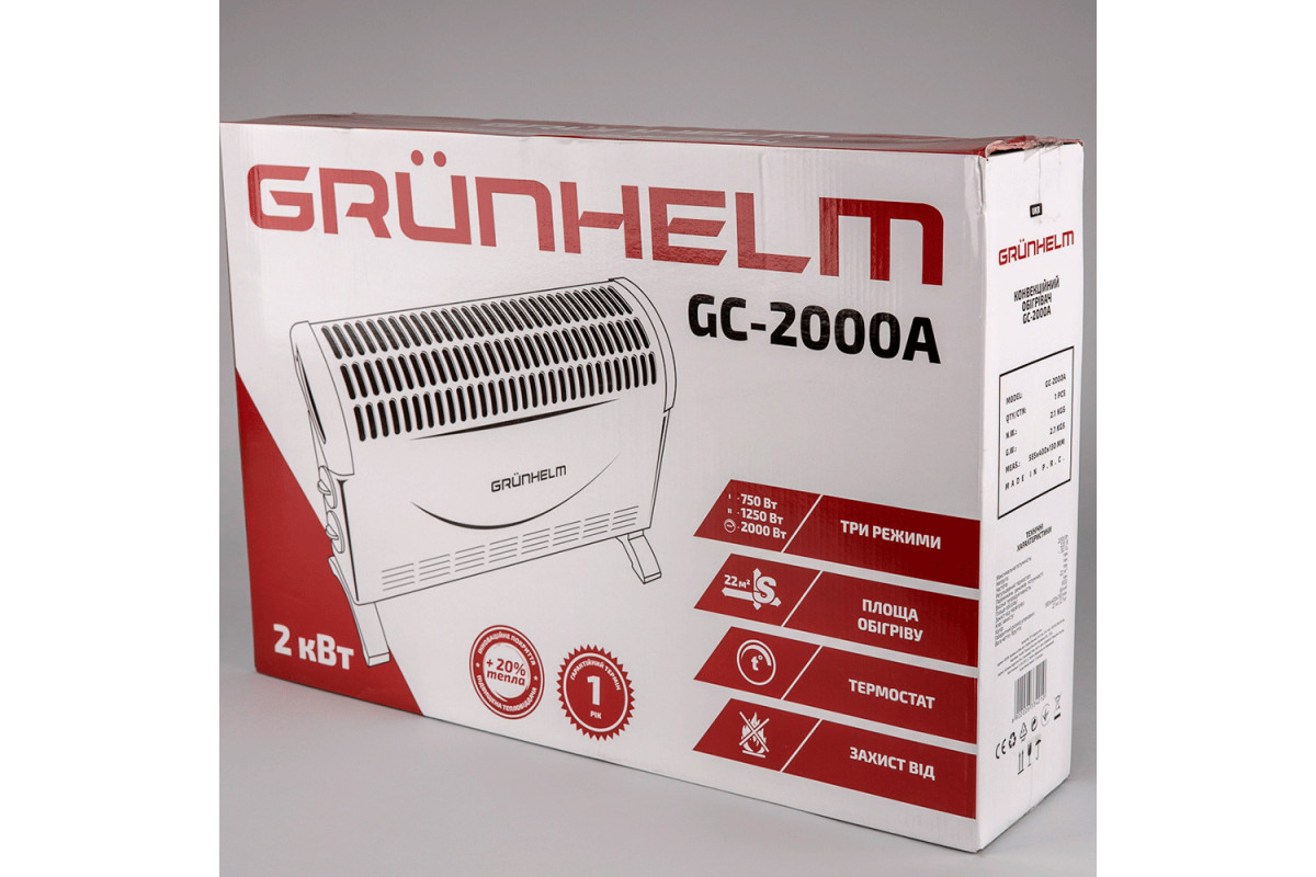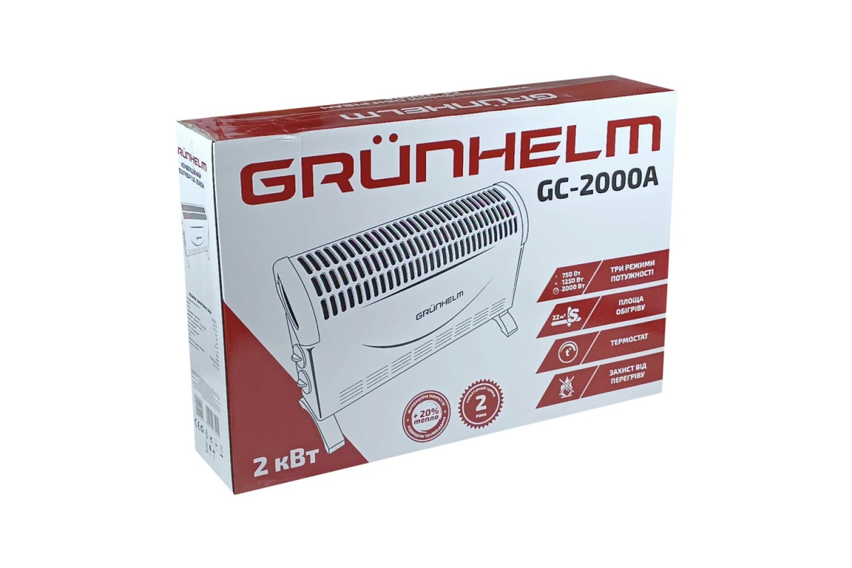 Grunhelm-електричний конвектор GC-2000A відноситься до сучасних пристроїв обігріву які можна застосовувати як в житлових, так і в нежитлових приміщеннях. Даний прилад простий і зручний у використанні, безшумний, екологічно чистий і найголовніше за лічені хвилини зможе обігріти будь-яке приміщення. Серед особливостей даної моделі слід зазначити наявність трьох режимів включення, які видають 2 кВт при необхідності.