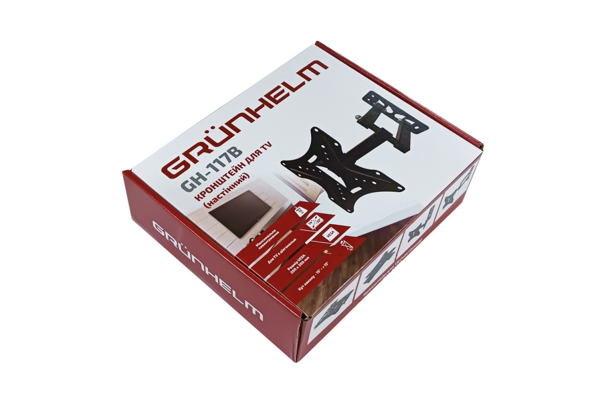 Кронштейн для телевізора GH-117B Grunhelm - підходить для телевізорів діагоналлю від 14 до 32 дюймів з максимальним навантаженням 25 кг - це універсальне кріплення, яке дозволяє встановити телевізор на стіну в будь-якому приміщенні. Кронштейн виконаний із міцного металу, що забезпечує надійність та довговічність його роботи. Має можливість повороту по горизонталі на ±90° та регулювання нахилу у ±15°.
