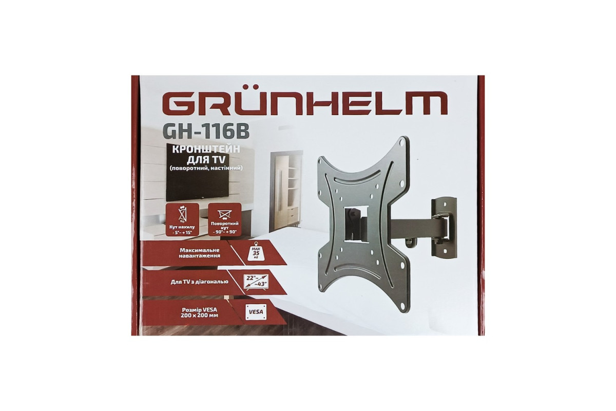 Кронштейн для ТВ Grunhelm GH-116B поворотний - підходить для телевізорів діагоналлю від 22 до 43 дюймів з максимальним навантаженням 35 кг - це універсальне кріплення, яке дозволяє встановити телевізор на стіну в будь-якому приміщенні. Кронштейн виконаний із міцного металу, що забезпечує надійність та довговічність його роботи. Має можливість повороту по горизонталі на ±90° та регулювання нахилу у ±15°.