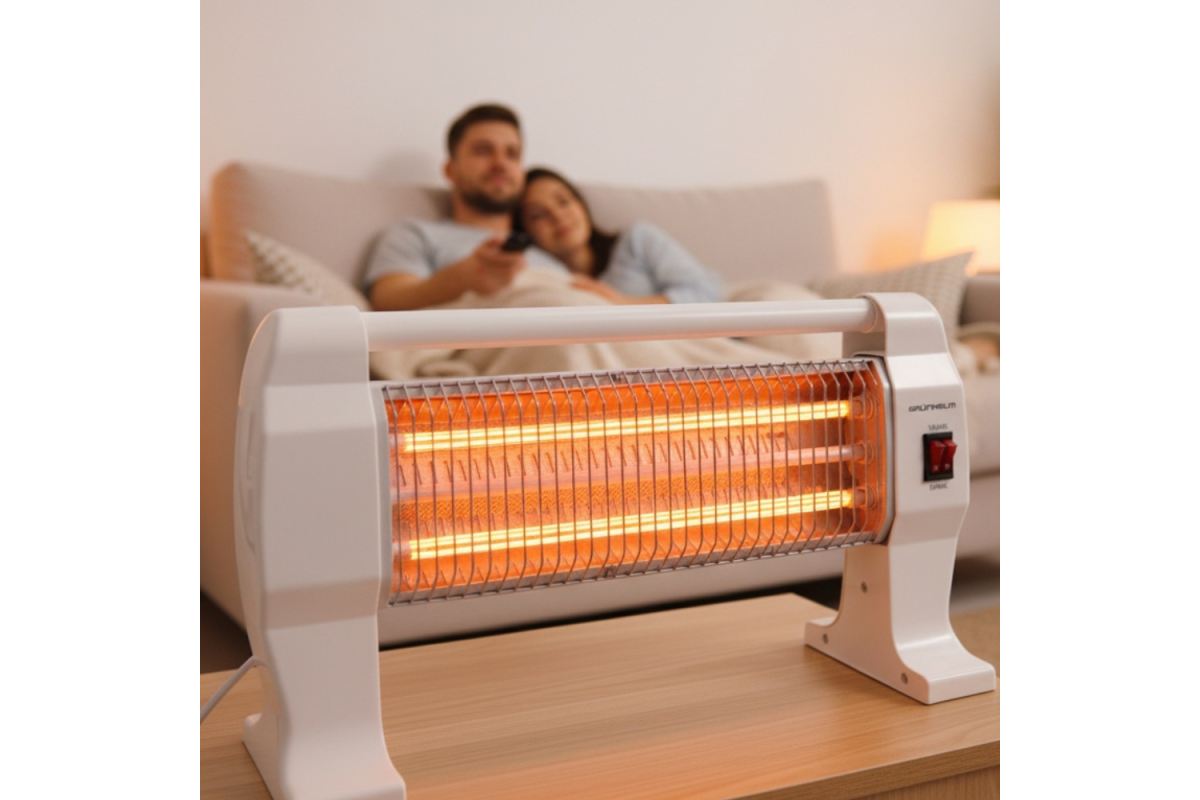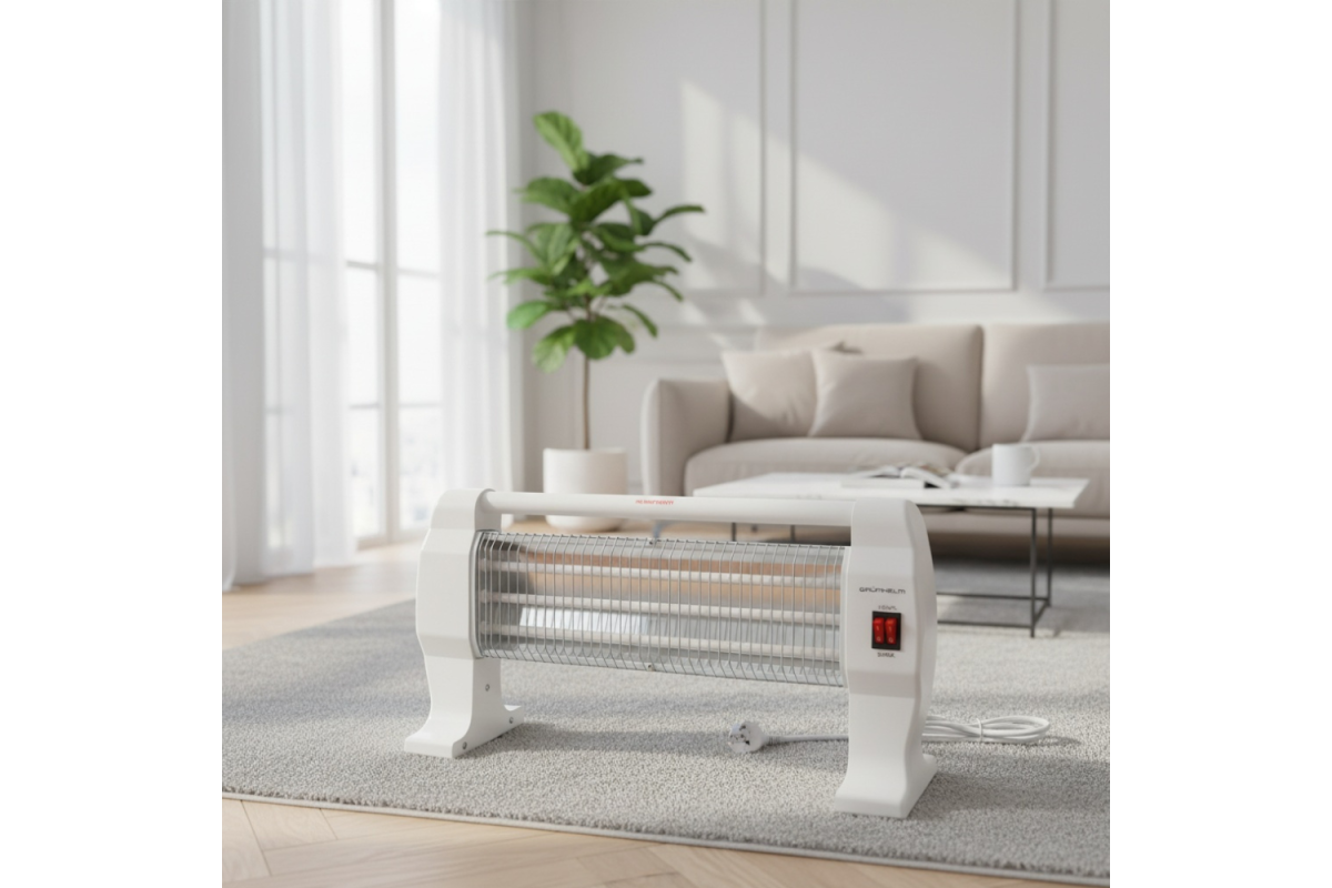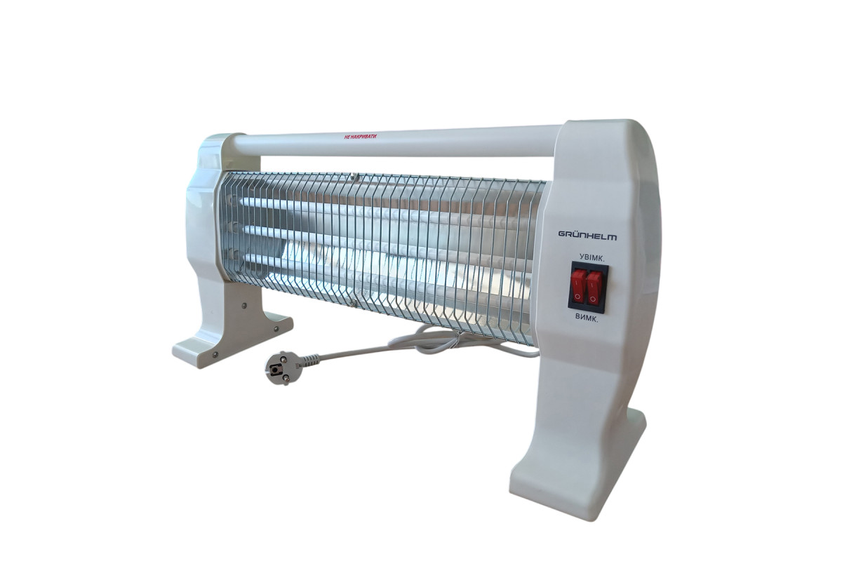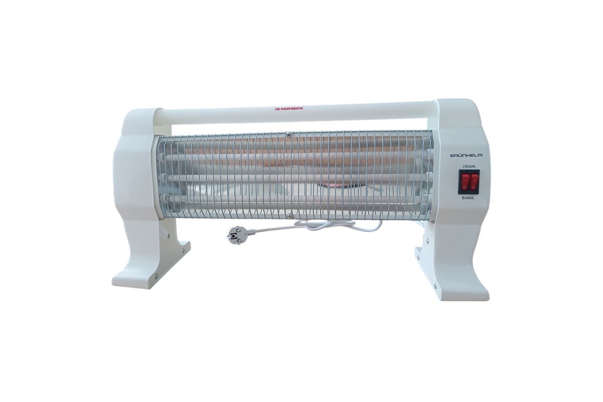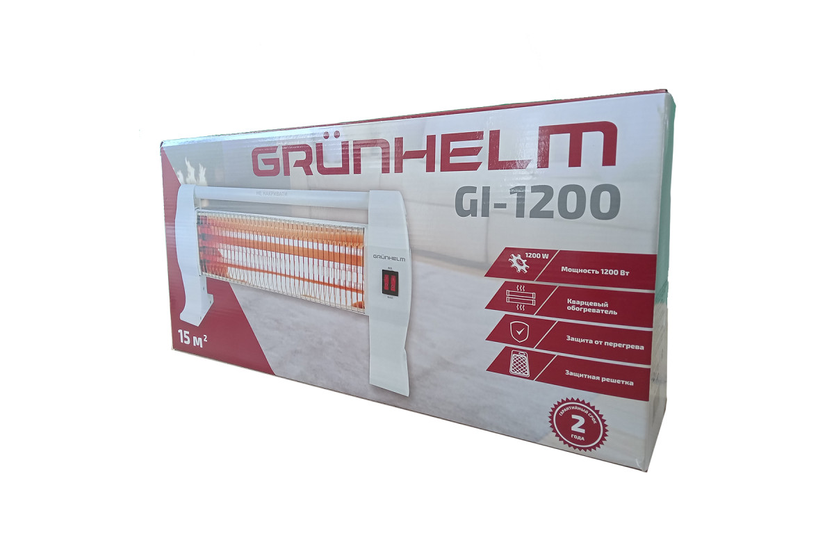GI-1200 Grunhelm – пристрій із кварцовим обігрівачем. Перемикач режимів потужності дозволяє вибрати потрібний температурний режим. Максимальне споживання приладу складає 1200 Вт, за допомогою якого можна обігріти приміщення площею до 15 квадратних метрів. Для безпеки користувача передбачено захист від перегріву.