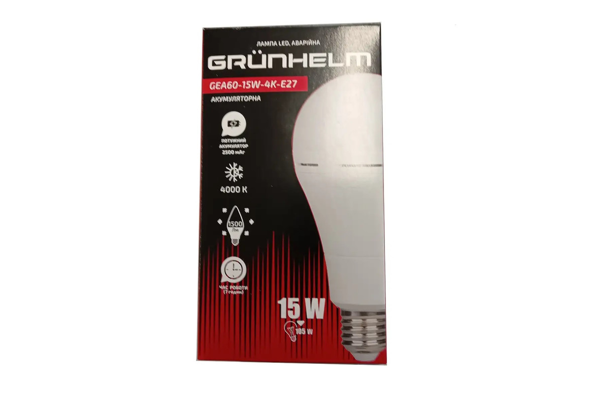 GrunhelmЛампа LED аварійна - GEA60-15W-4K-E27 (A60, 2500 мАг, 3г роб. до 50 лм і ще 4 г до розряду Grunhelm