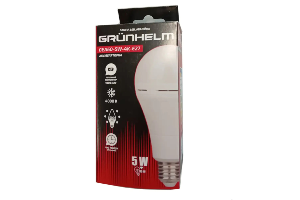 GrunhelmЛампа LED аварійна - GEA60-5W-4K-E27 A60, 1000мАг, 3г роб. до 50лм і ще 4г до розряду Grunhelm