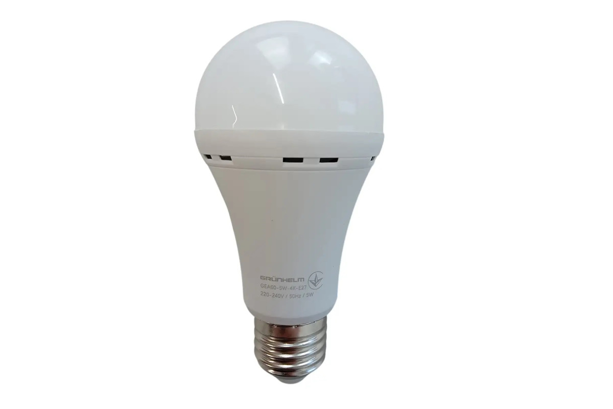 Лампа LED аварійна - GEA60-5W-4K-E27 Grunhelm заощадить від 900 кВт/год. за весь строк служби лампи. Не містить ртуті, безпечна для дітей і дорослих.