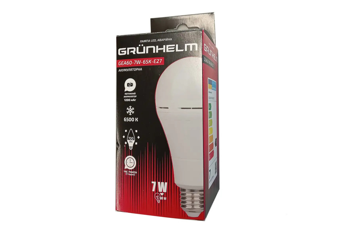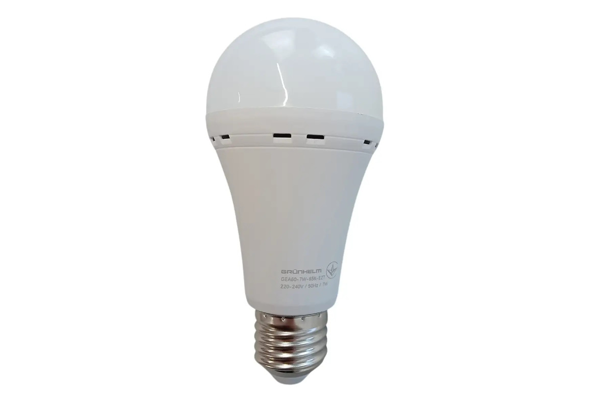 GrunhelmЛампа LED аварійна - GEA60-7W-65K-E27 A60, 1200 мАг, 3г роб. до 50лм і ще 4г до розряду Grunhelm