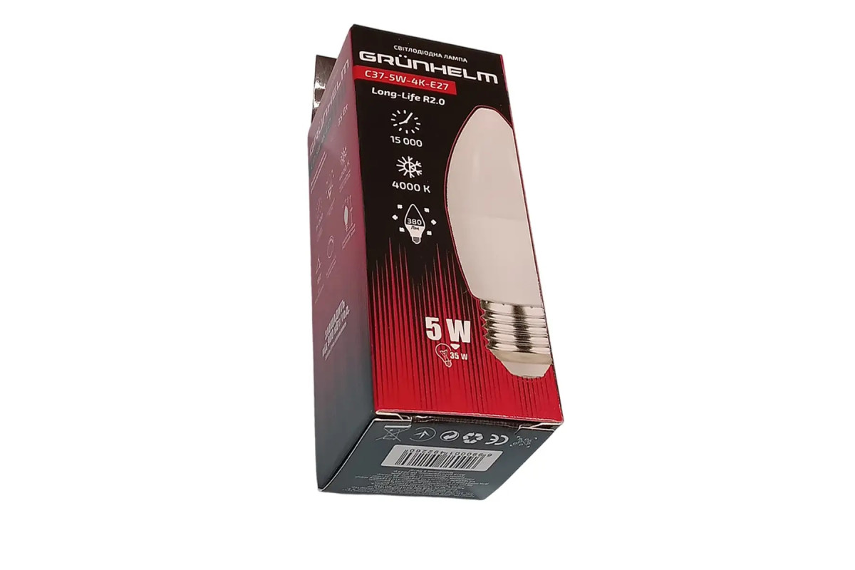 12 місяцівЛампа LED - C37-5W-4K-E27 Long-Life R2.0 Grunhelm заощадить від 900 кВт/год. за весь строк служби лампи. Не містить ртуті, безпечна для дітей і дорослих.