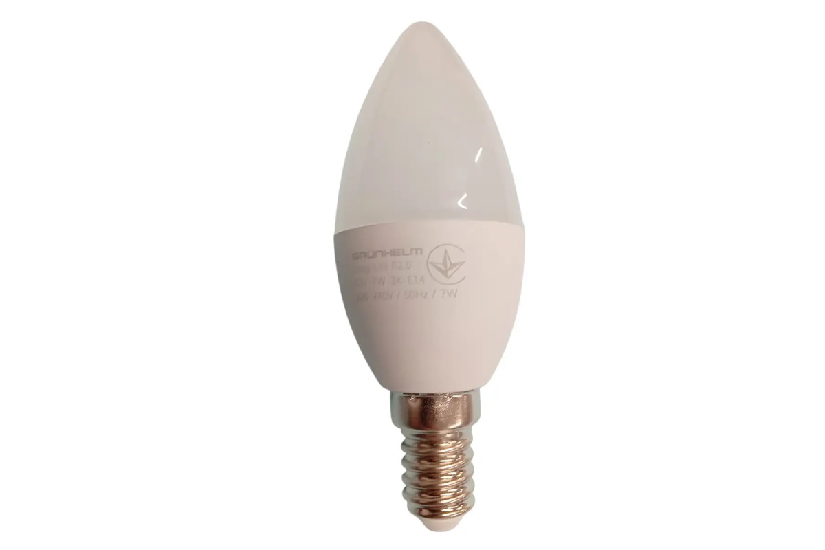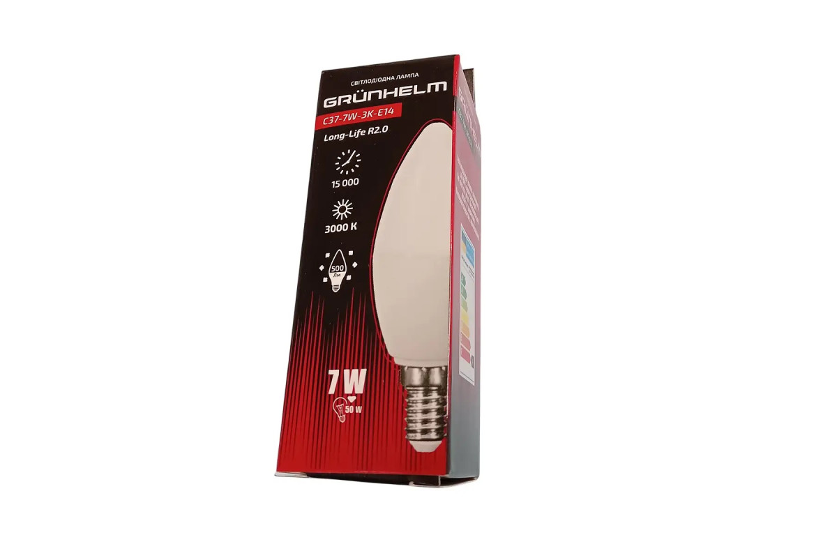 12 місяцівЛампа LED - C37-7W-3K-E14 Long-Life R2.0 Grunhelm заощадить від 900 кВт/год. за весь строк служби лампи. Не містить ртуті, безпечна для дітей і дорослих.
