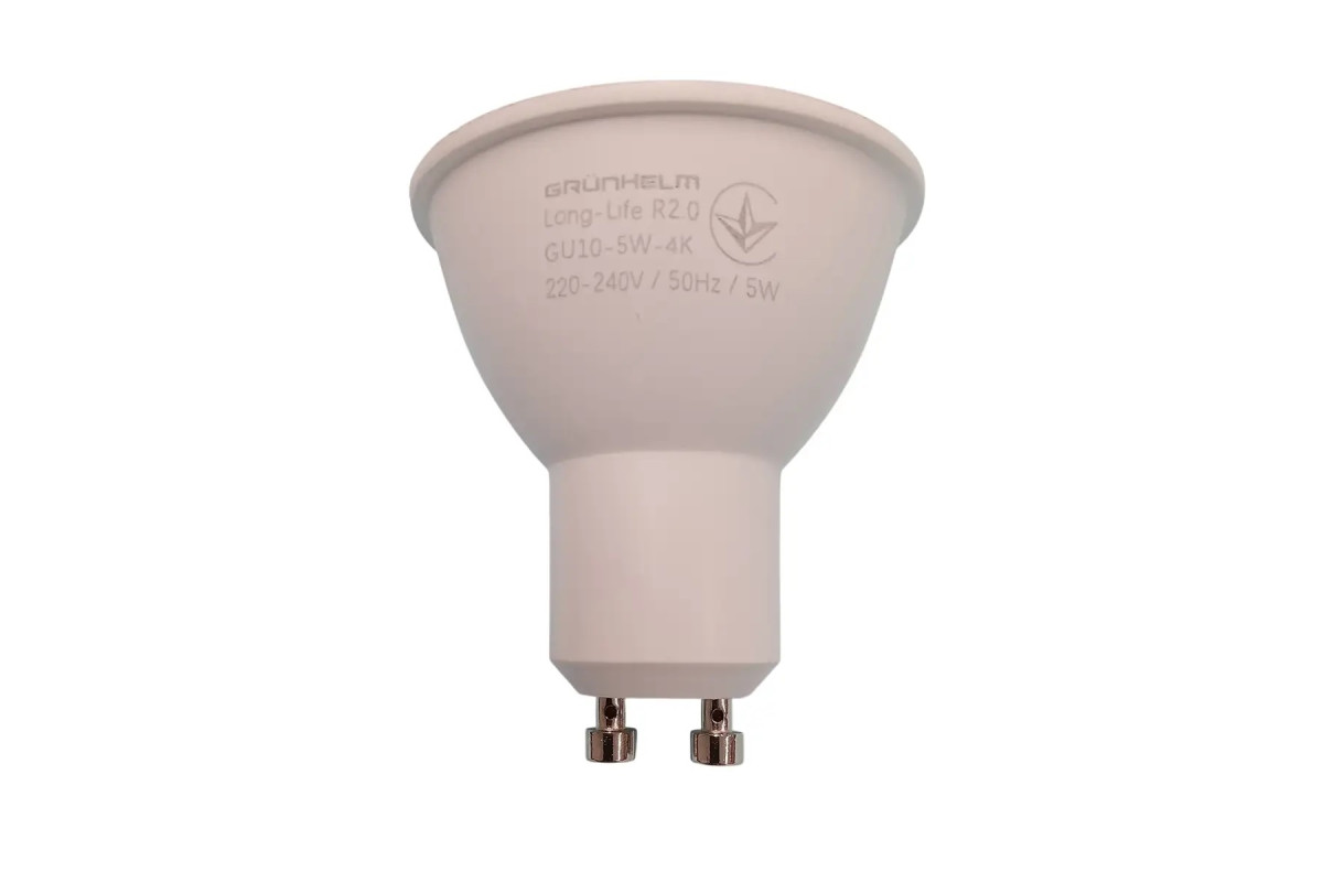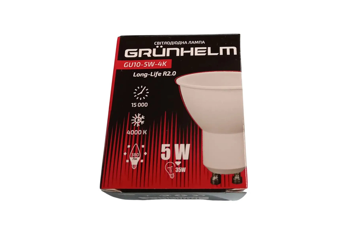 12 місяцівЛампа LED - GU10-5W-4K-E27 Long-Life R2.0 Grunhelm заощадить від 900 кВт/год. за весь строк служби лампи. Не містить ртуті, безпечна для дітей і дорослих.
