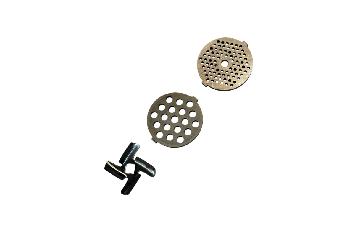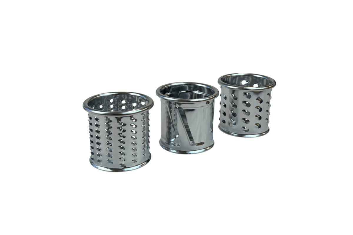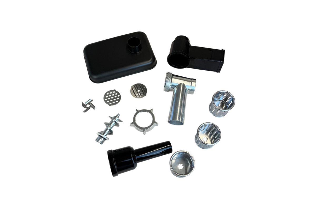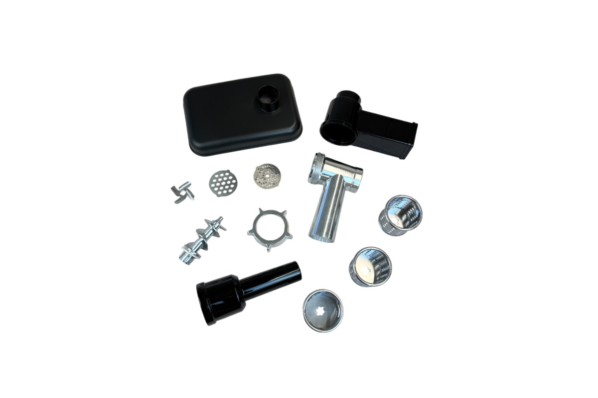 За допомогою набору аксесуарів, які входять до комплекту: 2 решітки для різного перемелювання м'яса, 3 барабани для нарізки та шинкування, насадки для ковбас та кеббе, можна швидко і легко приготувати безліч рецептів.