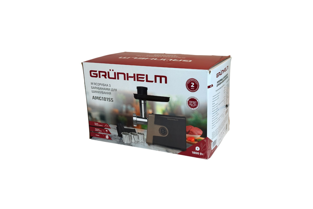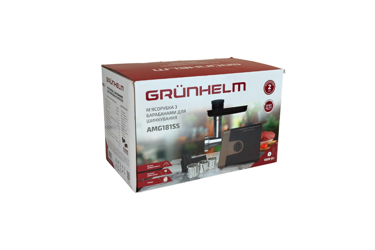 М'ясорубка електрична AMG181SS, 1800 Вт 2 решітки, насадка для ковбас і кеббе, реверс, 3 барабани для шинкування, продуктивість 1,7 кг Grunhelm