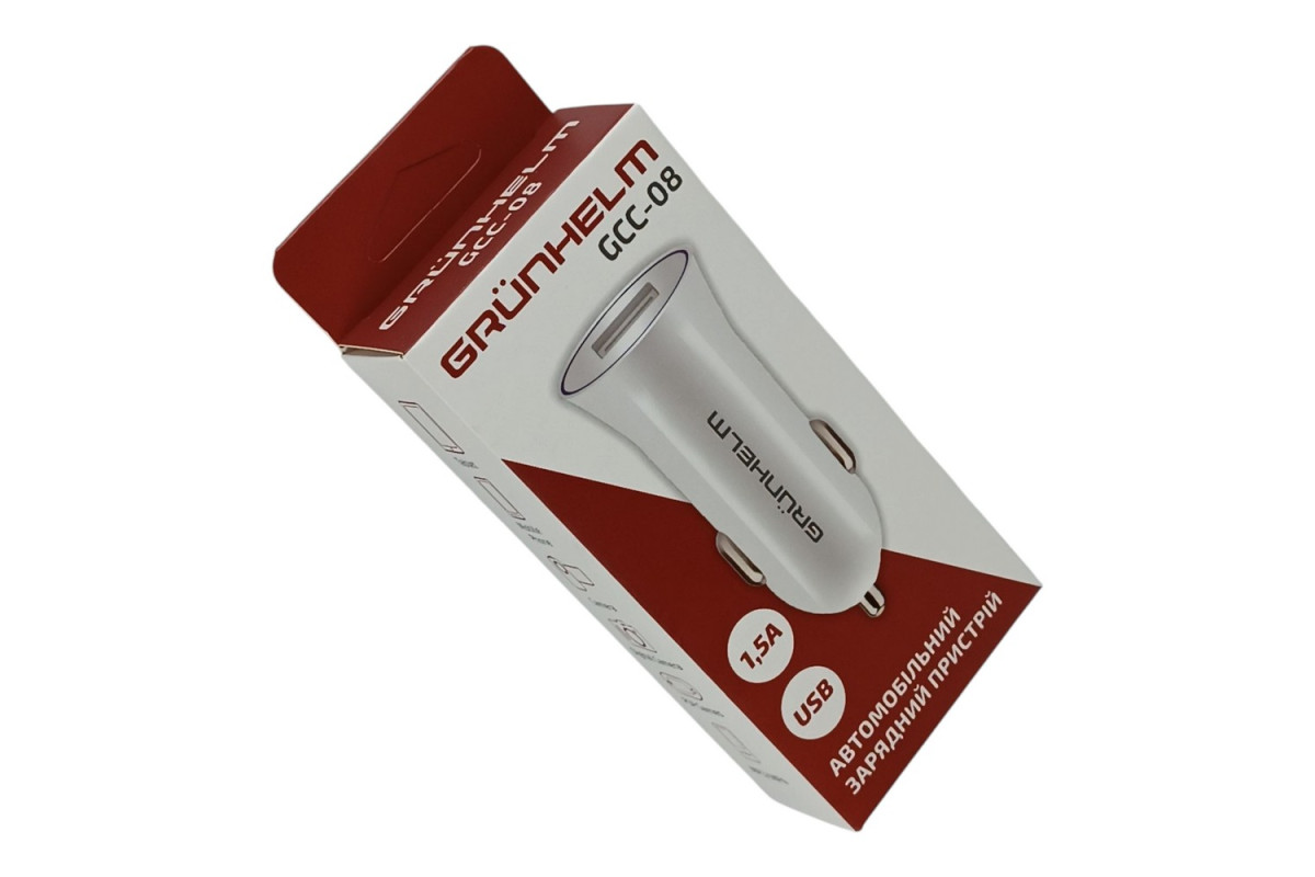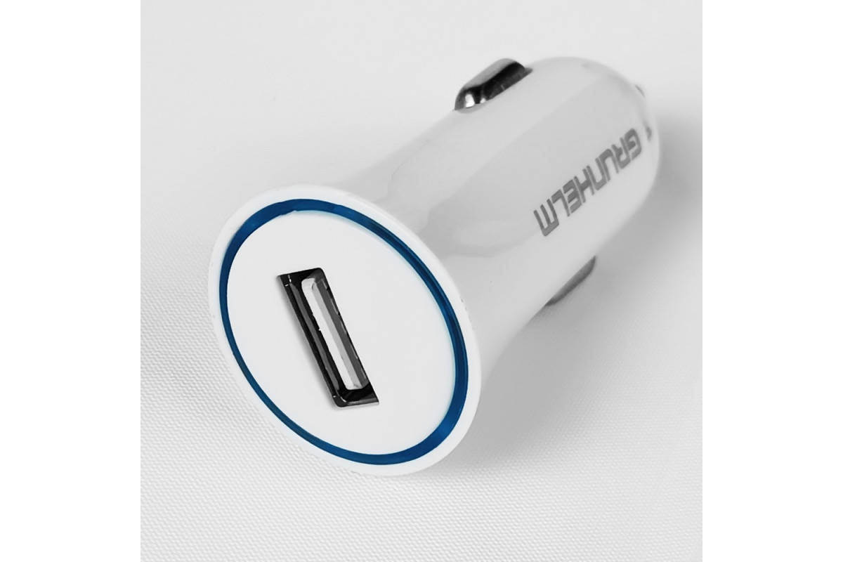 Автомобильное зарядное устройство для Grunhelm GCC-08 — миниатюрное устройство, способное подзарядить любую портативную технику: смартфон, планшет и т.п., подключая их к USB порту. Подключение самого зарядного устройства в автомобиле – к гнезду прикуривателя. Выходной ток USB порта – 1,5А, чего достаточно для быстрой зарядки любых гаджетов. Модель Grunhelm GCC-08 имеет стильный дизайн и крепкий корпус.