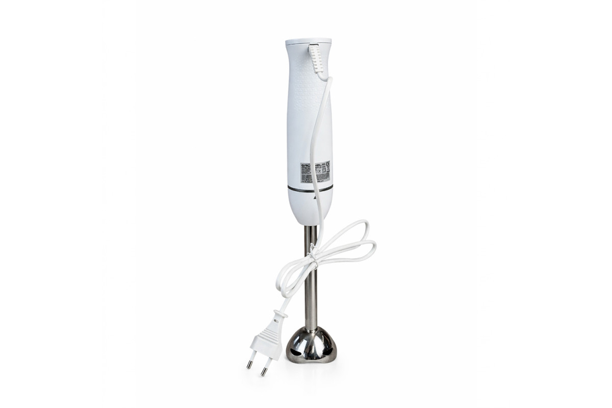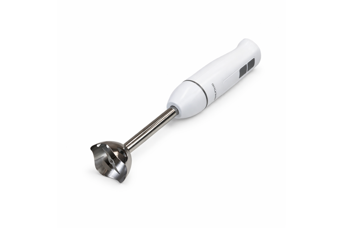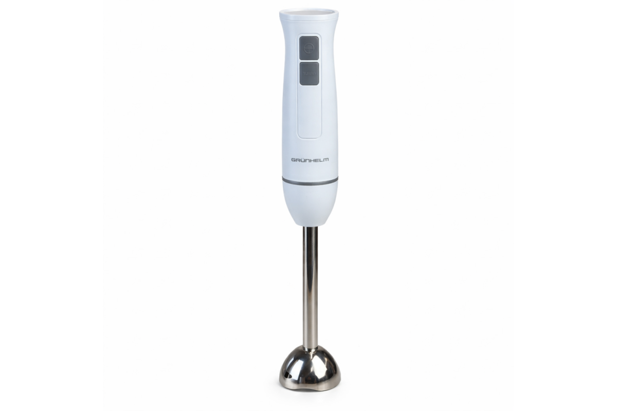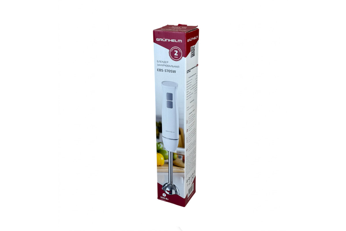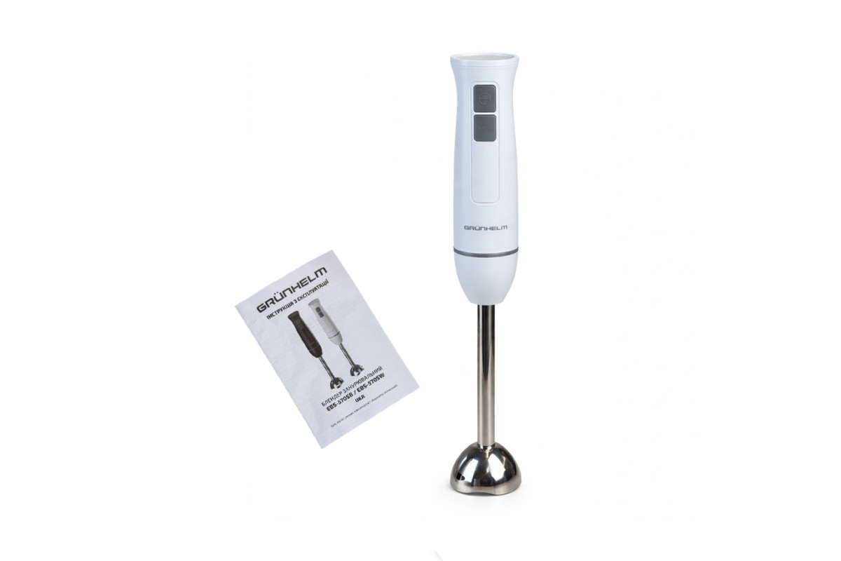 75x75x455 ммБлендер погружной EBS-570SW, 550 Вт Grunhelm – скорость, стиль и надежность в каждом движении. Прочная сменная насадка из нержавеющей стали с двумя лезвиями обеспечивает стабильный результат и долговечность. Благодаря поворотному замку насадки быстро и безопасно фиксируются, а интуитивное управление позволяет легко переключаться между двумя скоростями. Уход очень прост: насадку можно легко снимать и мыть. EBS-570SW – ваш универсальный помощник для ежедневных кулинарных задач.