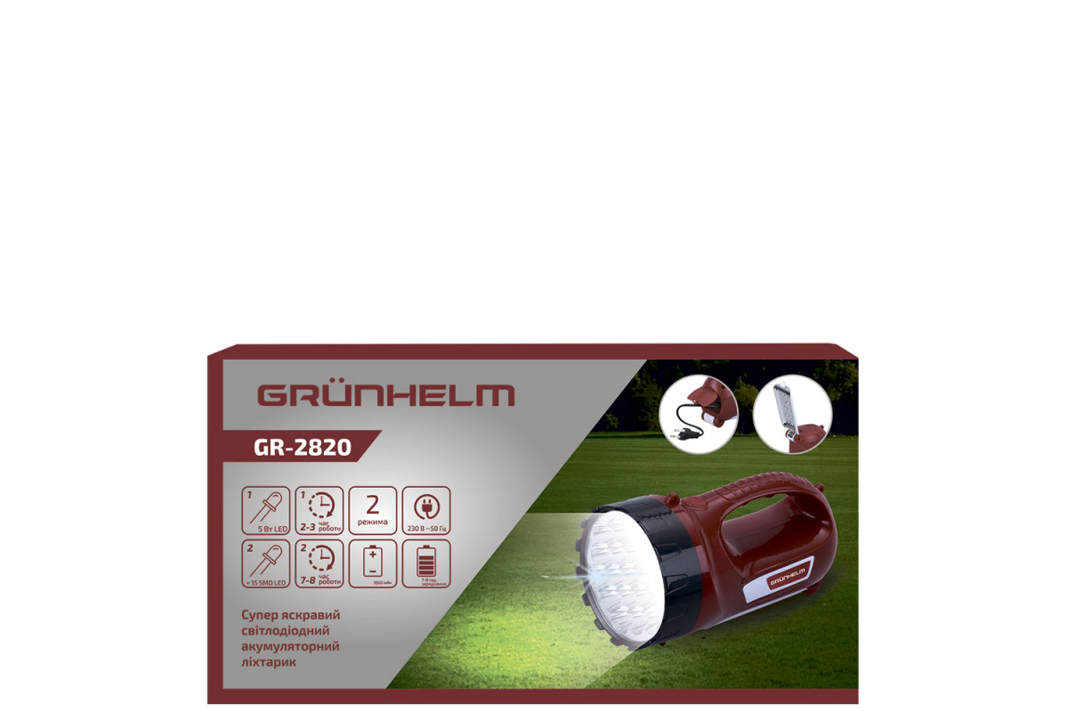 GR-2820 – это отличная модель для поисковых функций, также зарекомендовавшая себя на рыбалке, охоте, отдыхе. Незаменимый помощник в каждом доме! Для удобства фонарь оборудован ремнем для ношения на плече. Также источником света могут быть боковая светодиодная панель на 15 SMD светодиодов, которая отбрасывается и направляет свет в нужном направлении.