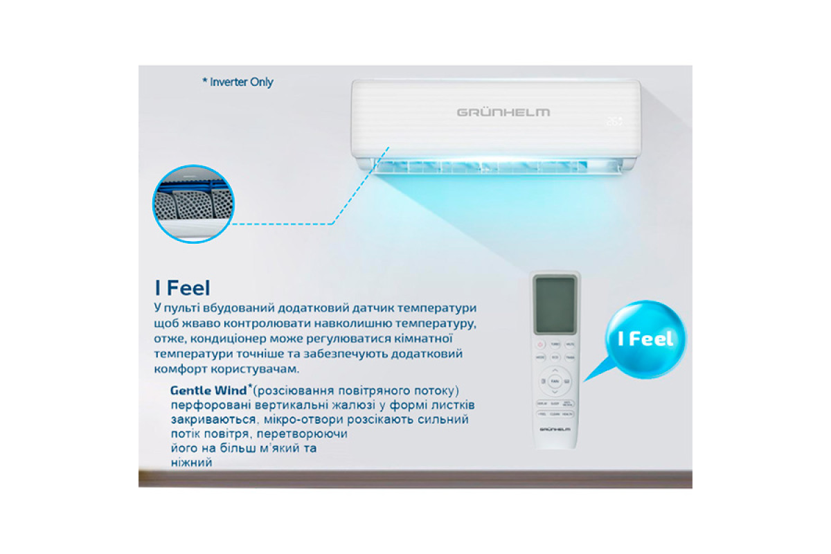 Настенный кондиционер компании Grunhelm – это мощный в своей бюджетной категории агрегат. Осуществляет охлаждение, обогрев, вентилятор, авто-осушение воздуха. Хладогент R32 – химическая формула CH2F2. Низкий уровень шума. Экономический режим. Независимая осушка. Таймер 24 часа. Дополнительный фильтр.