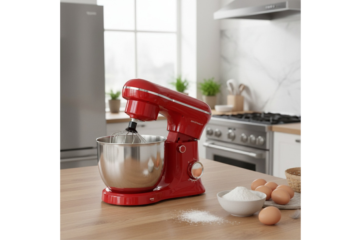 В комплект входят 5-литровая чаша из нержавеющей стали, венчик, крюк для теста и насадка для взбивания. Мощный мотор мощностью 1500 Вт позволяет легко готовить смеси, кремы и тесто для выпечки.