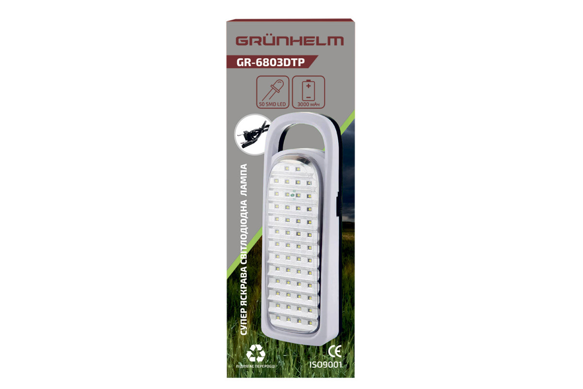 10 летЛампа LED, акум – GR-6803DTP (50SMD, 2400mAh) GRUNHELM – универсальный портативный светодиодный фонарь, простой в установке, применяется как для ежедневного использования, так и для резервного освещения, а также для аварийных случаев отключения электричества. Лампа имеет встроенную аккумуляторную батарею емкостью 2400мАч. Применение надежных SMD LED светодиодов позволяет обеспечить длительный срок службы лампы. Лампу универсальную в использовании, ее можно поставить на горизонтальную поверхность с помощью подставки или подвесить с помощью крючка. Если пользуетесь фонарем редко, для долговечности аккумулятора советуем каждые 3 месяца заряжать в течение 4-6 часов, нельзя заряжать аккумулятор более 15 часов.