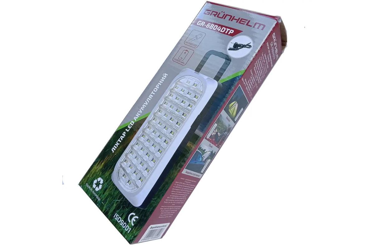 10 летЛампа LED акум – GR-6804DTP (44SMD, 1600mAh) GRUNHELM – универсальный портативный светодиодный фонарь, простой в установке, применяется как для ежедневного использования, так и для резервного освещения, а также для аварийных случаев отключения электричества. Лампа имеет встроенную аккумуляторную батарею емкостью 1600мАч. Применение надежных SMD LED светодиодов позволяет обеспечить длительный срок службы лампы. Лампу универсальную в использовании, ее можно поставить на горизонтальную поверхность с помощью подставки или подвесить с помощью крючка. Если пользуетесь фонарем редко, для долговечности аккумулятора советуем каждые 3 месяца заряжать в течение 4-6 часов, нельзя заряжать аккумулятор более 15 часов.