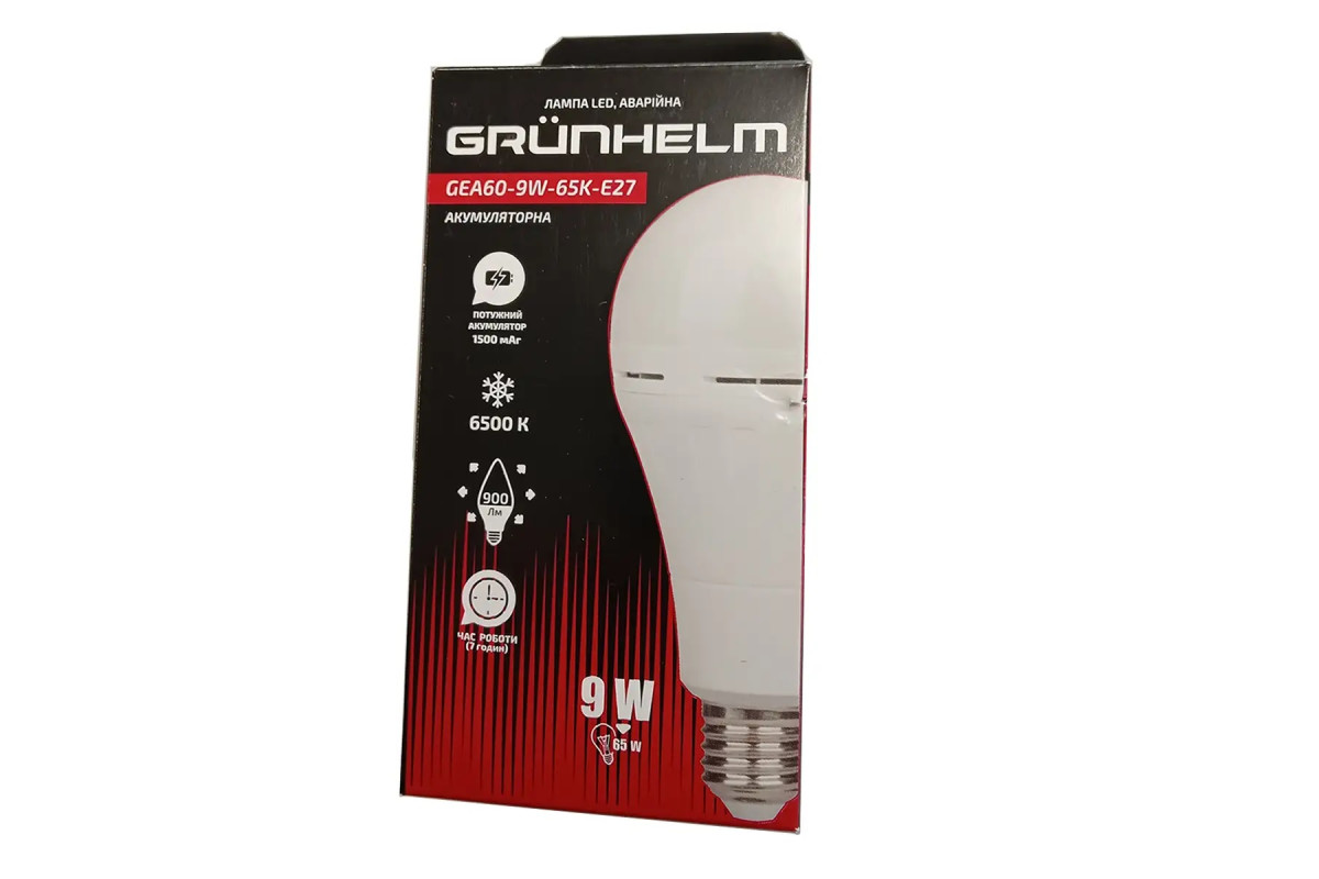 Мгновенный светЛампа LED, аварийная - GEA60-9W-65K-E27 A60, 1500мАч, 3г раб. до 50лм и еще 4г до разряда Grunhelm
