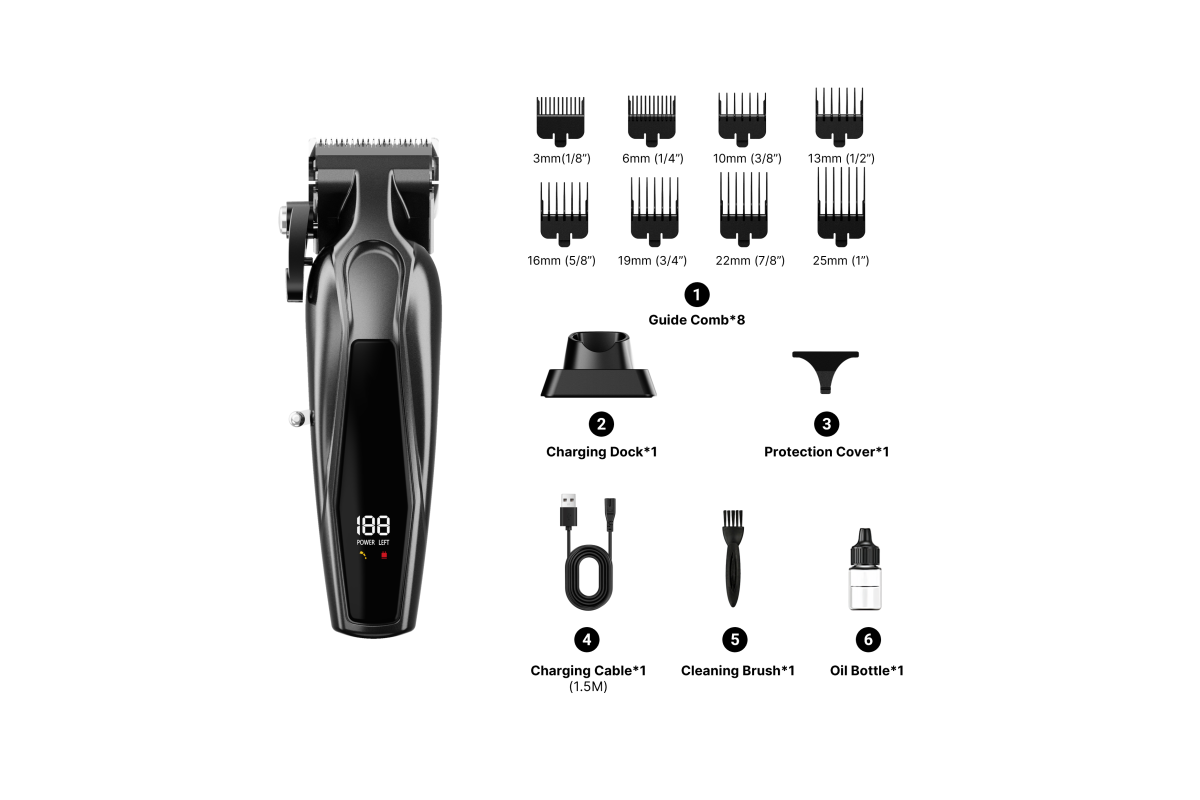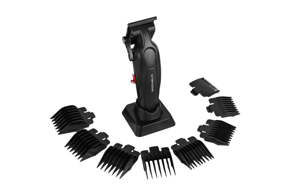 машинка для стрижки Grunhelm; Насадки – 8 шт Адаптер-подставка для зарядки; Защитная насадка Масло для лезвий USB кабель для зарядки; щетка для чистки; руководство по эксплуатации;