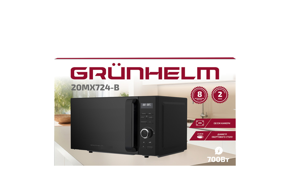 6990001466407Микроволновая печь Grunhelm20MX724-B мощностью 700 Вт. Модель имеет 11 уровней мощности, благодаря чему можно идеально подогреть продукт в зависимости от ваших потребностей.