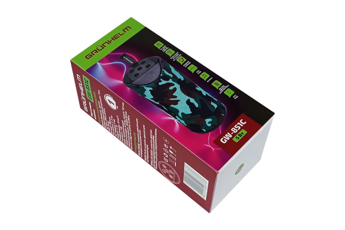 Портативная колонка GW-851C камуфляж Grunhelm - идеальный выбор для тех, кто любит слушать музыку в любом месте не волнуясь о качестве звука. Благодаря мощности 3 Вт на каждый динамик, эта колонка обеспечивает чистый и качественный звук даже на больших расстояниях. Колонка поддерживает Bluetooth 5.0, что позволяет подключать ее к любым совместимым устройствам беспроводно. Вы можете слушать музыку со своего смартфона, планшета или ноутбука, не требуя дополнительных кабелей. Встроенная батарея емкостью 800 мАч, обеспечивающая до 4 часов непрерывной работы.