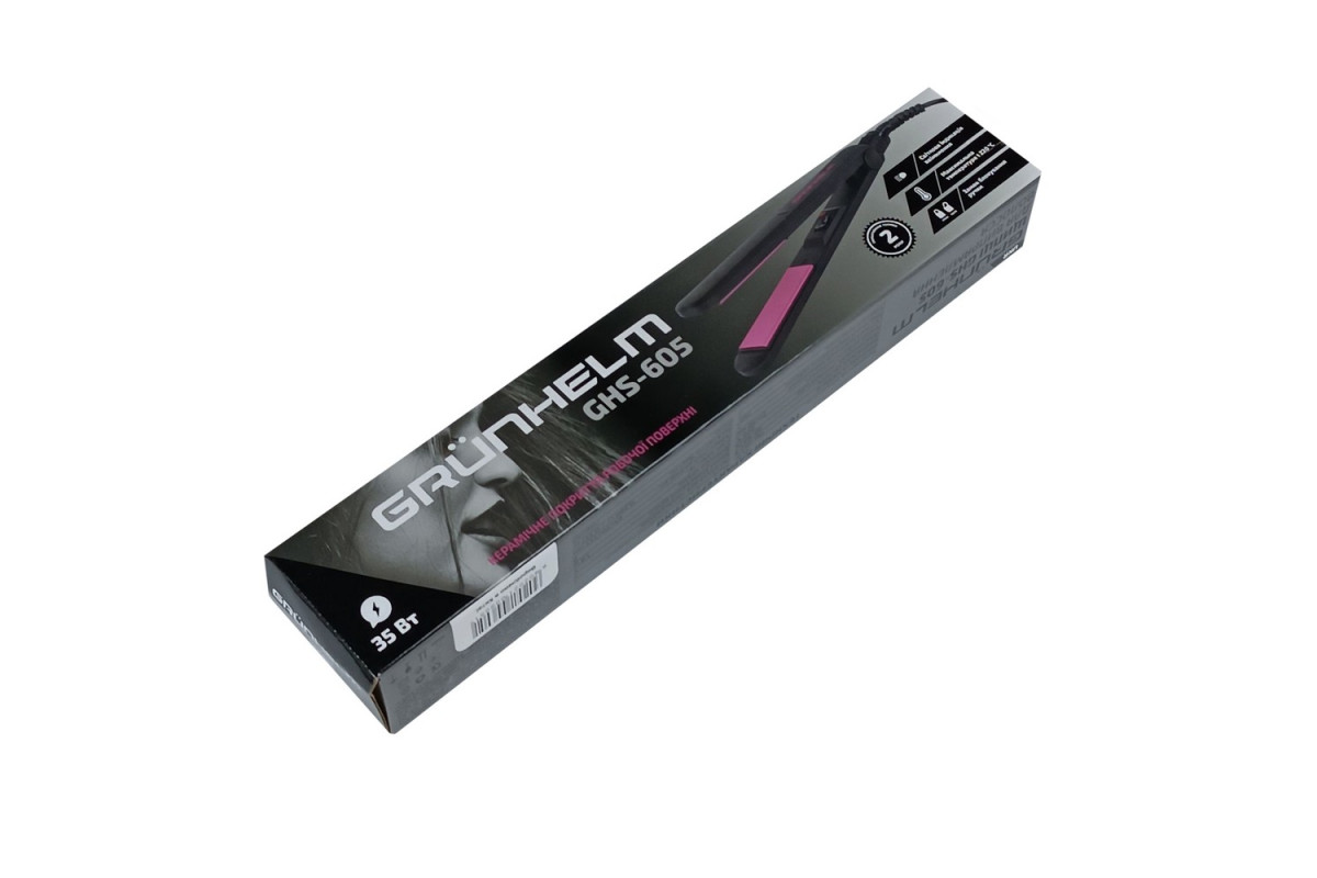 В приборе установлены рабочие пластины размером 25х90 мм, изготовленные из керамики. Это обеспечивает максимально качественную работу без повреждения волос. Утюг для волос Grunhelm GHS-605 имеет сетевой шнур длиной 1,8 м, который может вращаться на 360 градусов. Это позволяет комфортно эксплуатировать прибор, не сковывая движения.