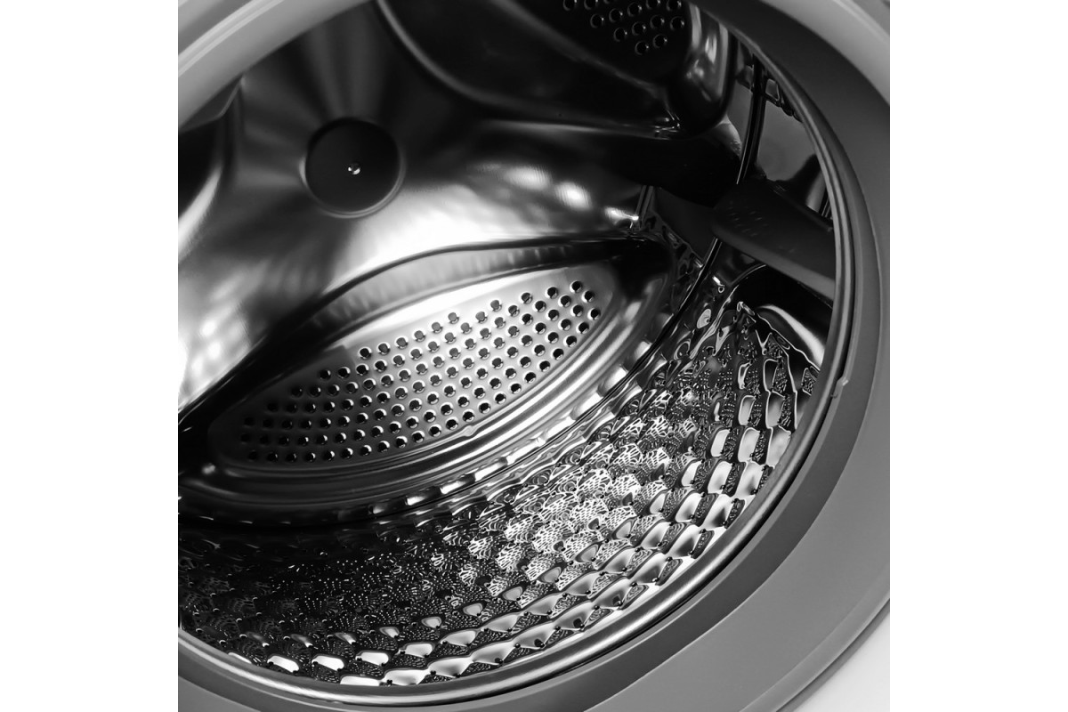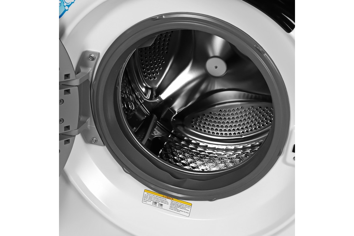 Люк в форме иллюминатора черного цвета смотрится стильно на белой машинке, корпус которой выполнен из эмалированной стали и пластика. Бак разборного типа изготовлен из нержавеющей стали, за счет чего его срок службы достаточно высок.