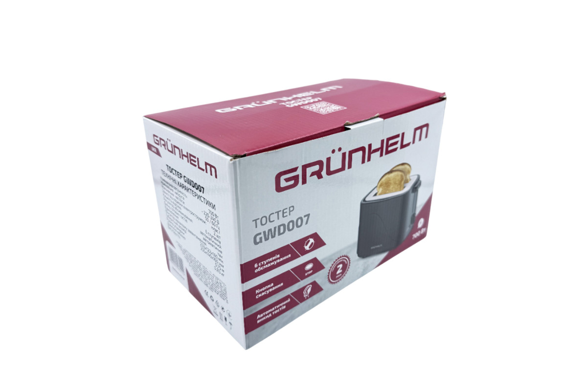 Тостер Grunhelm GWD007 представляет собой небольшое кухонное приспособление, исполненное в классическом стиле белого цвета. Благодаря своей удобной прямоугольной форме, он может легко разместиться в любом, даже самом маленьком уголке кухни. Корпус изделия выполнен из качественного пластика, в процессе работы не нагревается, что позволяет прикасаться к нему, не боясь обжечься. Что касается технических характеристик, то они универсальны для приборов этого класса.