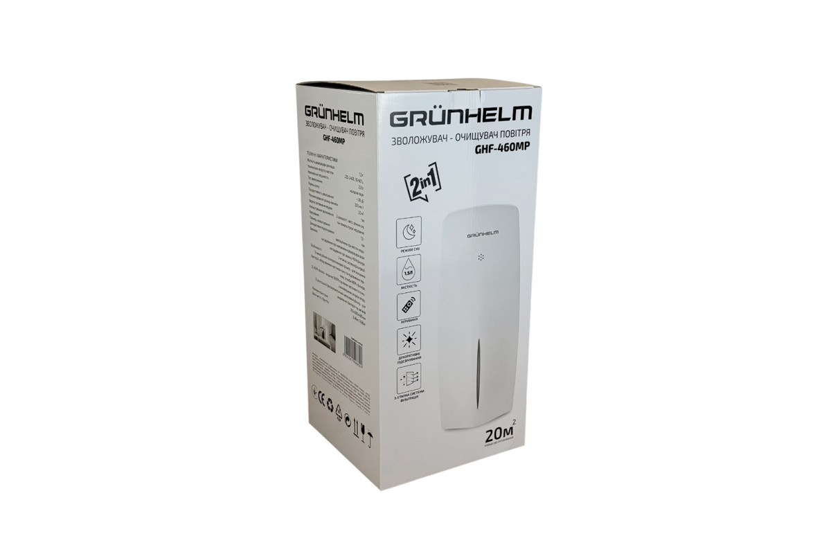 Увлажнитель-очиститель воздуха 2 в 1 – GHF-460MP Grunhelm – ультразвуковой увлажнитель позволит поддерживать здоровую атмосферу и уют в вашем доме. Оснащен функцией автоматического отключения, надежно защищен от перегрева при критическом снижении воды в резервуаре. напоминание о наполнении резервуара воды; напоминание о замене HEPA фильтра