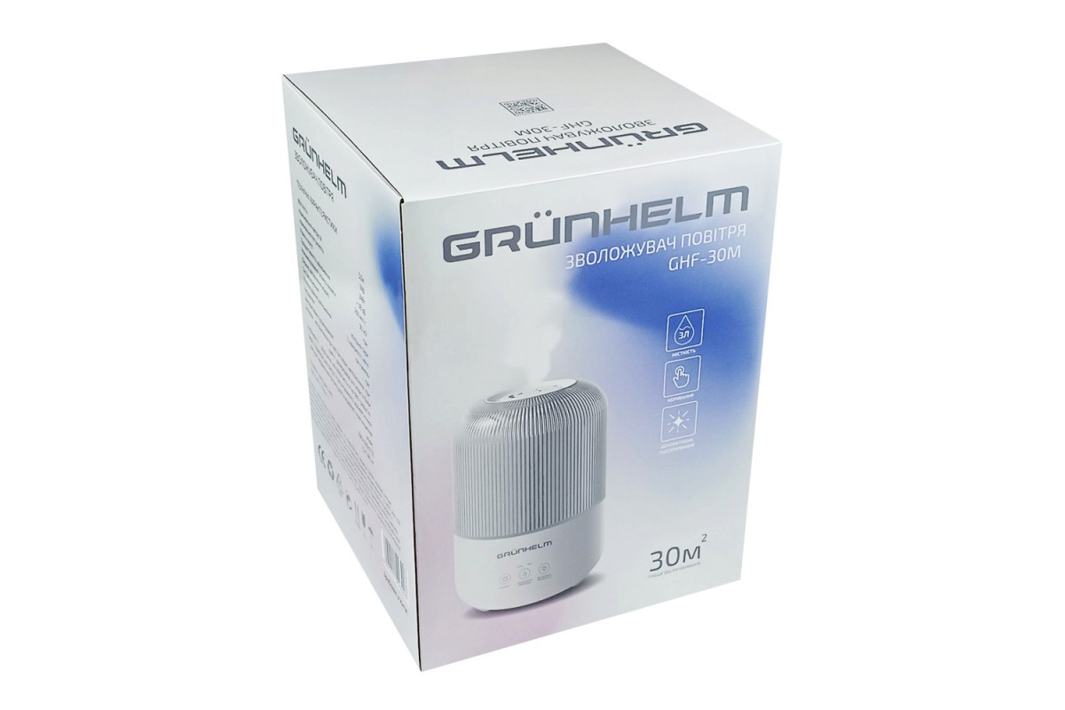 Увлажнитель воздуха – GHF-30M (30 м кв, 3л, 280 мл/ч) GRUNHELM – ультразвуковой увлажнитель позволит поддерживать здоровую атмосферу и уют в вашем доме. Выполненный в компактном корпусе размерами 198x198x272 мм, он не займет много места в помещении и при этом будет эффективен на площади до 30 м2. В компактном корпусе увлажнителя установлен вместительный 3л резервуар для воды, которого хватит для нескольких полноценных процедур увлажнения воздуха. Управлять увлажнителем легко с помощью тач панели. Оснащен функцией автоматического отключения, надежно защищен от перегрева при критическом снижении воды в резервуаре.