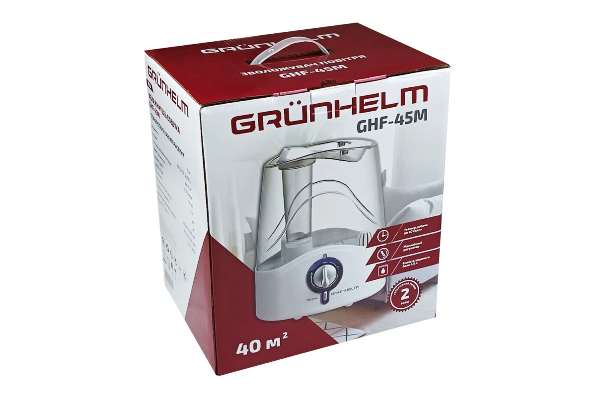 1.28 Увлажнитель воздуха GHF-45M GRUNHELM – увлажнение происходит с помощью ультразвуковой мембраны повышенной производительности. Механический регулятор уровня увлажнения. • Устройство помогает обеспечить нормальный уровень влажности в помещении, улучшить качество воздуха и облегчить дыхание человека; • Благодаря большому баку для воды (4.5 литра) увлажнитель может работать до 20 часов; • Площадь эффективной работы увлажнителя воздуха до 40 квадратных метров благодаря мембране высокой производительности; • Модный и стильный дизайн, который впишется в любой декор.