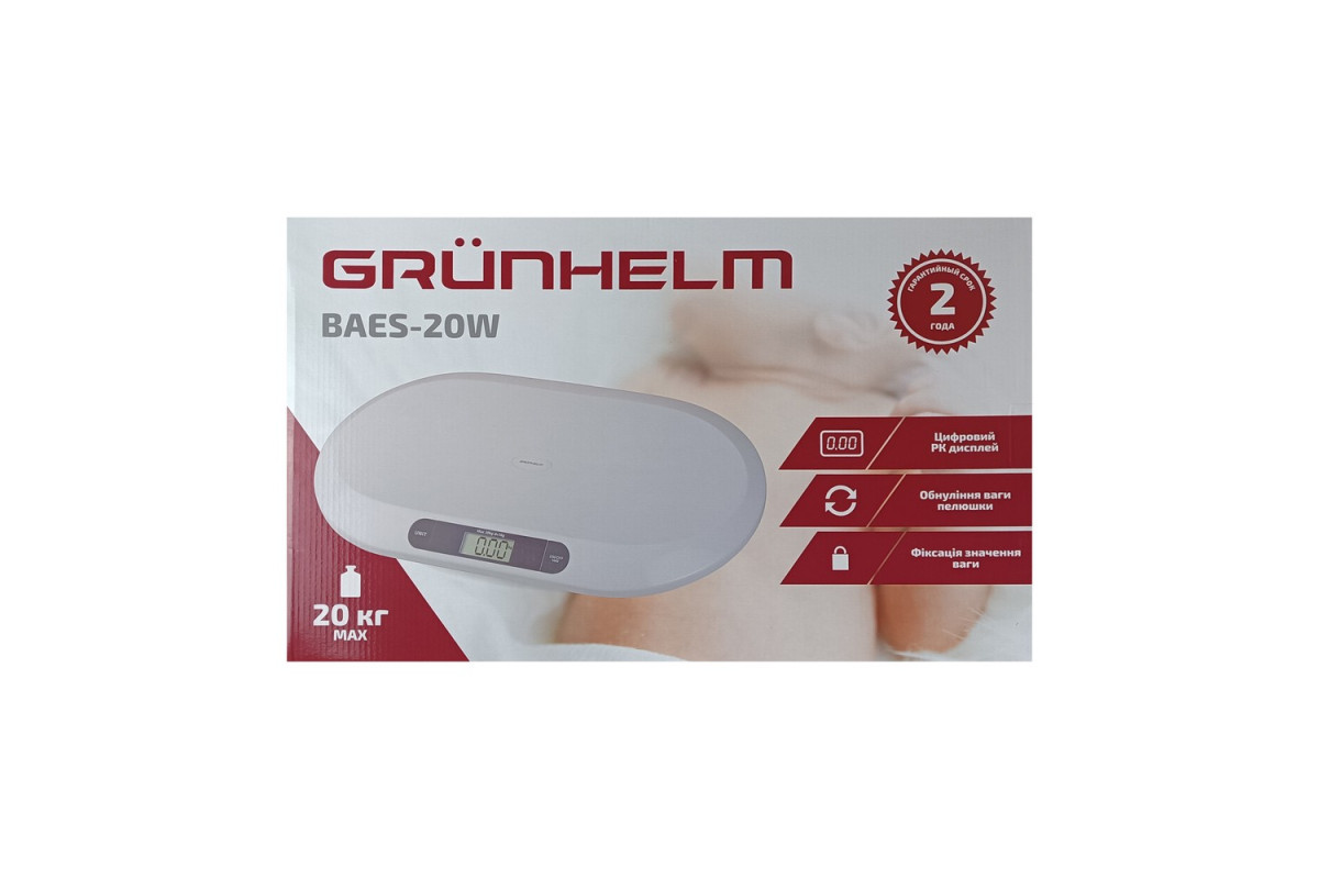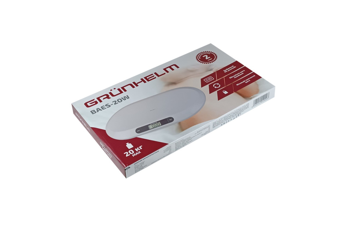 550х35х330Ваги дитячі BAES-20W Grunhelm – призначені для зважування немовлят. Велика точність ваги в 10 г дає можливість легко контролювати параметри дитини. Ваги оснащені великою платформою та функцією HOLD завдяки якій зважити дитину можна навіть коли вона рухається. Модель має функції автоматичного відключення, фіксацію значення ваги, а також обнулення ваги пелюшки.